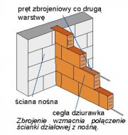 Szczególnej uwagi wymaga łączenie ścian wewnętrznych konstrukcyjnych z zewnętrznymi. Musi być ono wykonane w sposób, który gwarantuje przekazywanie pomiędzy nimi obciążeń pionowych i poziomych. Jest to możliwe dzięki wiązaniu elementów murowych lub stosowaniu metalowych łączników, bądź zbrojenia przechodzącego w każdą ze ścian. Przy czym konieczne jest, aby obie ściany były wznoszone (i łączone ze sobą) równocześnie.